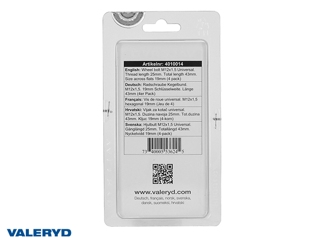 Hjulbolt Konisk M12x1,5 Universal. Gänglängd 25mm. Tot.längd 43mm. Nøckelvidd 19mm (4-pack)